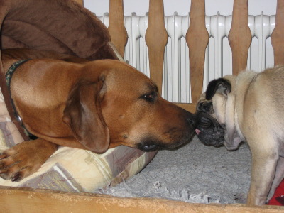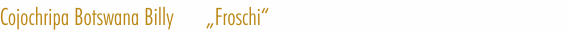 Froschi wurde, wie schon ihre Mutter Laya - „Cojochripa Aida“, bei uns geboren und ist somit eine Enkelin unserer unvergessenen Stammhündin Idgie – „Malama Delle Cime Bianche“. Ihren legendären Großvater „Apalachee Umquolo Of Pronkberg" konnten wir auf der großen Jubiläumsschau in Harare 1997 live erleben, ein wunderschöner Rüde mit einem „Jahrhundertgangwerk“ und so lag nahe, seinen nicht weniger schönen Sohn Baxter - "Danest Tjabo Letsatsi" als Partner für Laya zu wählen. Baxter war aber nicht nur bildhübsch, sondern auch von ausnehmend gutem und ausgeglichenem Charakter, der sich in seinen Kindern wieder findet. Froschi ist eine knapp mittelgroße, knochenstarke, substanzvolle Hündin, mit flüssigem, kraftvollem Gangwerk und kerngesund. Sie ist sehr freundlich und umgänglich mit kleinen und großen Menschen, verträglich mit Artgenossen, sowie Katzen, Kaninchen, Meerschweinchen und weiterem „Kleingetier“, das sich in einem Tierarzthaushalt eben mal für kurze oder längere Zeit einfinden kann. In der von mir geleiteten Welpenschule docs Hunde ABC ist Froschi nachsichtig und tolerant mit Hundebabies aller Rassen und begleitet die Spielstunden begeistert von Zeit zu Zeit. Am Pferd ist sie ein ausdauernder und problemloser Reitbegleithund, sehr führig und gut kontrollierbar, wie auch auf Spaziergängen. Besonders dieses ausgeglichene Wesen unserer Nachzuchthündin hat uns dazu bewogen sie auch als Zuchthündin einzusetzen